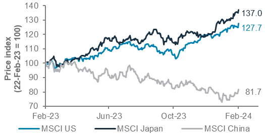 US, Europe and Japan equity markets hit all-time highs this week. Yet, beneath this upturn, markets are seeing a nascent switch in leadership. Since the Lunar New Year, China, and more broadly Asia ex-Japan and other Emerging Markets, have outperformed Developed Markets (DM) on the back of a strong rebound in China’s domestic tourism during the holidays and another raft of stimulus measures from Beijing. While it has only been a few days, is this the start of a new trend?