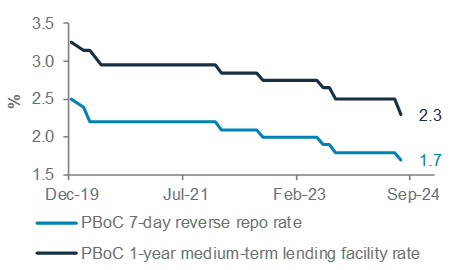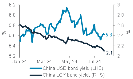 This week, the PBoC cut key policy rates, including a 10bps reduction in the seven-day repo rate on Monday, followed by a 20bps cut in its medium-term lending facility (MLF) rate on Thursday, bringing the latter to its lowest level since April 2020. The China government bond yield curve bull steepened, with the 10-year China government bond yield edging to a historical low of 2.18%. We believe the PBoC will continue to guide yield curve steepening. Recent policies, such as reducing the collateral required for MLF to encourage long bond selling in the secondary market, supplement the bond-borrowing scheme launched two weeks ago.