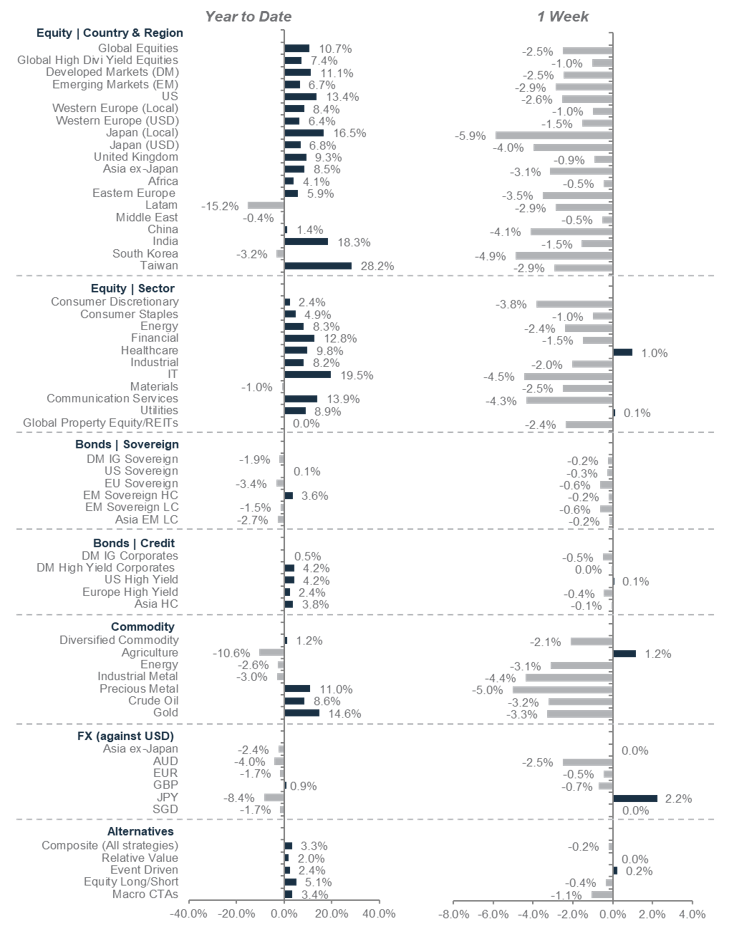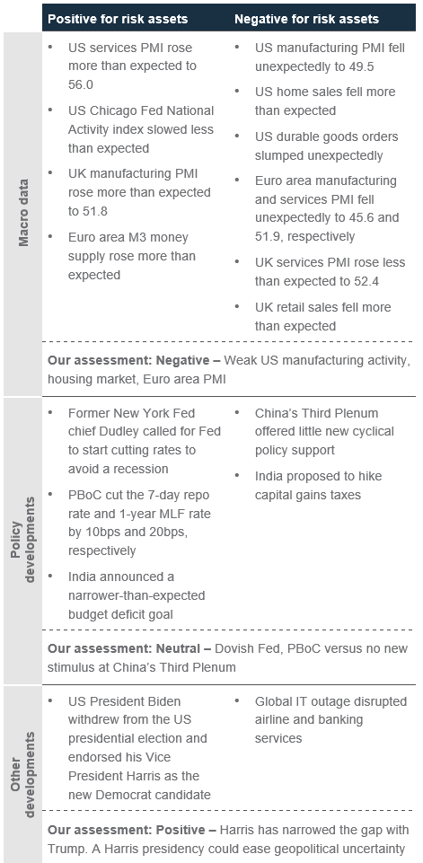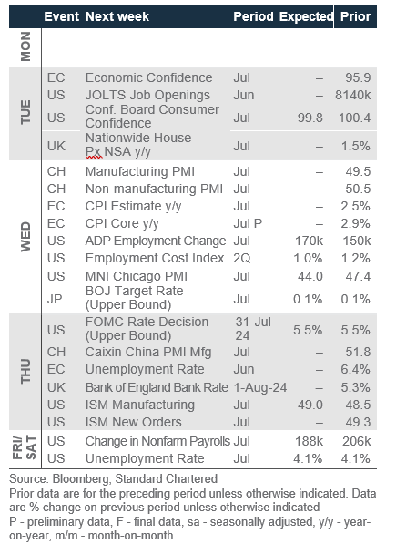 Fed rate cuts coming: We expect the Fed to signal the first rate cut of the cycle as soon as its policy meeting next week as it shifts its focus from curbing inflation to supporting growth. US inflation has continued to cool after a brief surge in Q1 and economic activity data has fallen short of estimates since May, with labour and housing markets softening.