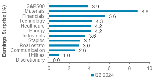 US earnings have been robust. According to LSEG I/B/E/S, of the 181 companies that have reported earnings so far, the S&P500 index has delivered earnings growth of 11.8% in Q2, while earnings in the communication services and information technology sectors outperformed significantly, at 23.9% and 17.9%, respectively.