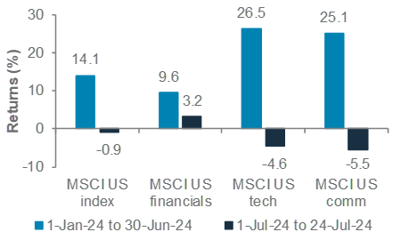 Although Q2 GDP growth (2.8% q/q annualised) beat estimates on the back of strong consumption, a softening job market has increased the urgency for the Fed to act to prevent a further rise in the unemployment rate. We now expect the Fed to cut rates twice this year, likely in September and then in Q4, as it seeks to manage an economic soft-landing. Fed rate cuts are likely to put a floor under US equities, with the dovish policy shift particularly benefitting the rate-sensitive growth sectors.
