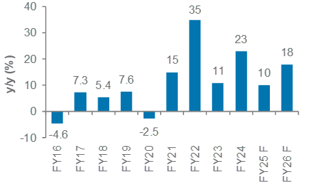 Broad-based economic growth should help sustain the strong earnings growth momentum and superior ROEs, supporting our preference for India large-cap equities, where we find valuations more reasonable now compared to earlier peaks.