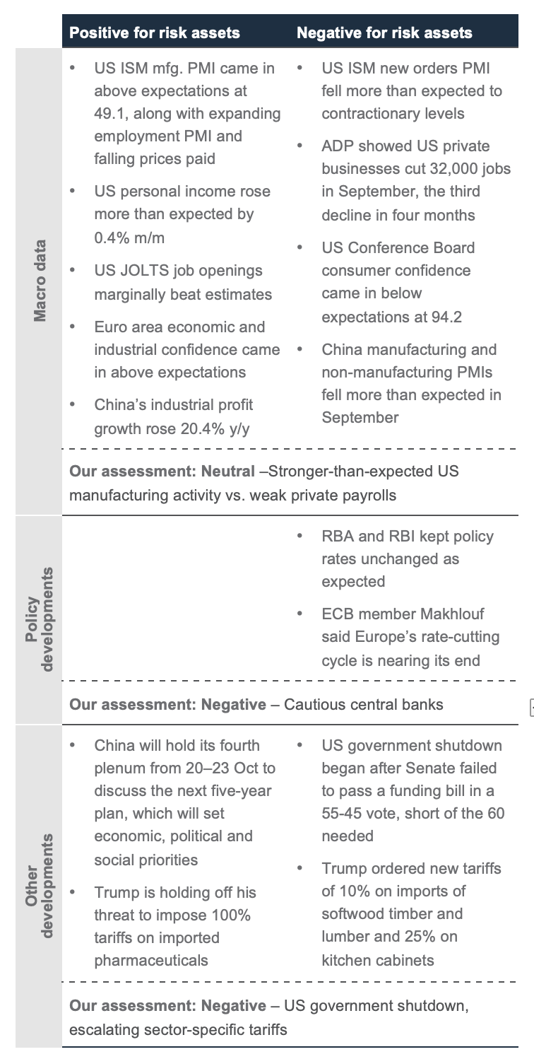Strategy summary: The US government shutdown is a potential near-term risk for markets. Our base case is a 2-3-week shutdown, which is likely to have limited market impact. A shutdown lasting beyond 2-3 weeks, coinciding with stretched investor positioning, could cause a short-term pullback in risk assets. For tactical investors, it is prudent to lock in gains on excessively concentrated positions. Longer-term investors should consider using any pullback to add to our preferred equity markets (US and Asia ex-Japan) and US technology, communications and healthcare equity sectors which are backed by a strong earnings outlook.