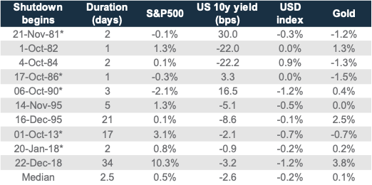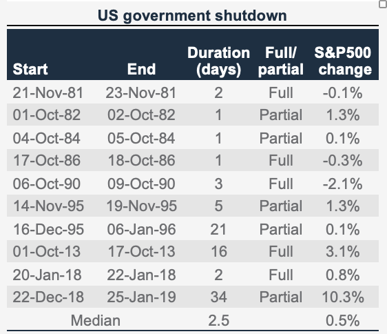 The US government shutdown is a near-term risk for markets. Our base case is a 2-3-week shutdown, which is likely to have limited market impact.