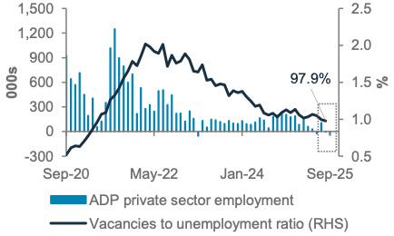 (-) factors: US government shutdown, contracting private payrolls, escalating sector-specific tariffs