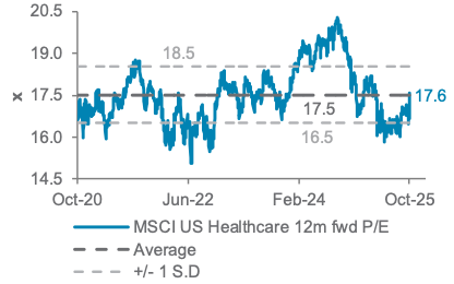 We upgraded the US healthcare sector to Overweight in our latest Global Market Outlook. There is continued innovation of new patent drugs, ramping-up on local production and fading policy uncertainty. Valuation of the sector is still compelling, despite the recent rise in share prices, with the MSCI US Healthcare index trading around its 5-year average on a 12-month forward P/E basis, at 17.6x. Earnings projections for 2025 and 2026 are also positive at 12.8% and 9.8% respectively (source: LSEG I/B/E/S).