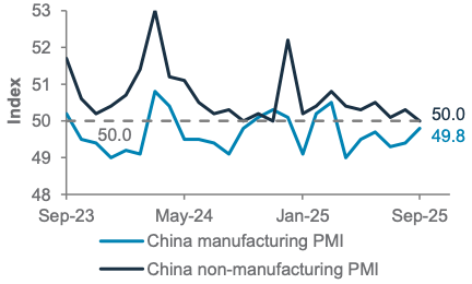 Opportunity to add to preferred sectors: We would see any shutdown-driven market drawdown as an opportunity to add to our preferred equity markets – the US and Asia ex-Japan. The structural AI-driven growth story driving the technology sector in the US, Europe and China will remain in place regardless of the length of the government shutdown. The sector is supported by upward earnings revisions, with US Q3 earnings growth now estimated at 8.8%, up from 8% at the start of Q3. Meanwhile, the US healthcare sector has caught a tailwind from recent agreements between some sector leaders and the Trump administration that alleviates tariff concerns (see page 5).