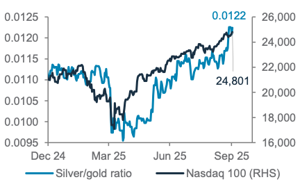 Silver has advanced relative to gold, alongside the broader rally in risk assets