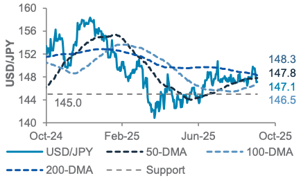 Downside risk for USD/JPY: A US government shutdown beyond a few weeks will likely push USD lower. We see downside for USD/JPY, with a test of 145 support, especially if Agriculture Minister Koizumi wins the ongoing leadership race for Japan’s ruling Liberal Democratic Party in a run-off. Koizumi backs BoJ rate hikes and supports policy normalisation. There is an increasing chance of the BoJ hiking rates on 30 October.