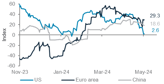 Strong earnings: US corporate earnings remain robust, with growth broadening out beyond the technology-related sectors. Almost four-fifths of the S&P500 index companies which have reported Q1 earnings have beaten estimates (vs 66% long-term average). As a result, earnings growth estimates for full-year 2024 and 2025 have been revised higher to 10.3% and 14%.