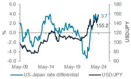 Although likely policy intervention helped USD/JPY avoid a break above 160, the risk remains tilted towards further upside in the short term (our 3m view: 156), given a still-strong USD and a patient BoJ. The real rate differential between the US and Japan still favours the USD. For now, markets continue to expect the Fed to cut rates in H2 24 (total of 35bps by year-end). We see the pair retreating to 150 in this scenario (our base case). However, if the Fed postpones easing to 2025 amid sticky inflation, USD/JPY could surge to 165-166.