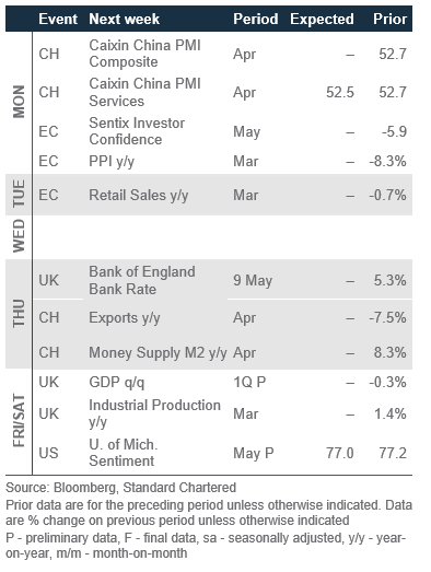 The Fed’s dilemma: The Fed expects growth to slow in the coming quarters as two-decade high interest rates impact the economy, helping cool the job market and lower inflation later. This explains why Fed Chair Powell, after keeping rates steady at the 1 May policy meeting, reiterated his base case that the Fed is more likely to cut rates later this year than hike.