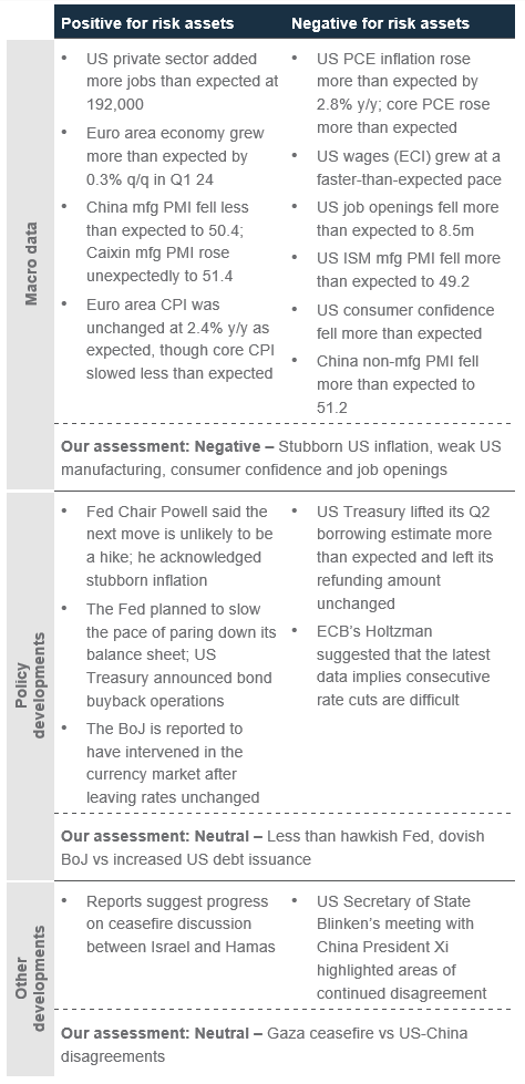 Our weekly net assessment: On balance, we see the past week’s data and policy as negative for risk assets in the near term