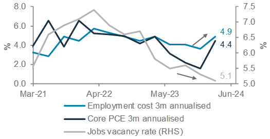 US inflation and wage pressures have rebounded lately; we expect a cooling job market to ease wage pressures in H2 24