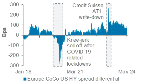 Yield premium difference for European AT1s and US HY bonds (positive spread = positive AT1, or CoCo, yield premium over US HY bonds)