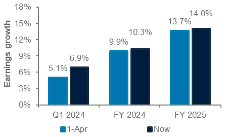 US earnings growth for Q1 and for 2024 full year and 2025 full year have been revised up since 1-Apr-24
