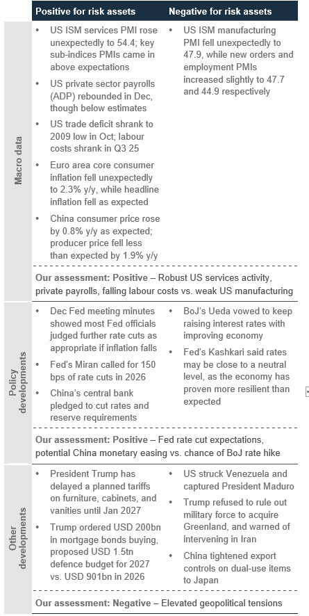 Positive start to year: The US capture of Venezuelan leader Maduro and threats to take Greenland have not dented the equity bull market, now entering its fourth year. Strong corporate earnings outlook globally, on the back of resilient economic data (see page 3), supportive fiscal policies and Fed rate cuts provide a solid fundamental backdrop to risk assets. However, as the events at the start of the year have shown, diversification and hedging remain key in the new year. This underscores our positive stance on Asia ex-Japan equities (besides US equities), Emerging Market bonds, gold and gold miner equities and alternative assets. The recent wave of AI-related IPOs in China highlights robust investor demand for technology stocks, backing our bullish outlook for the market.
