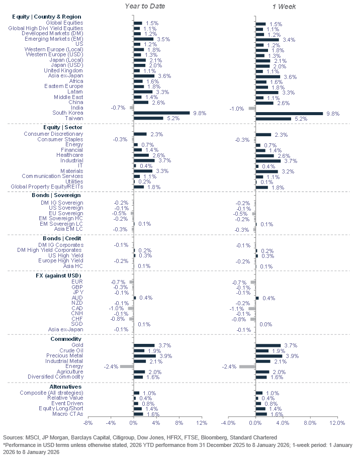 Risk assets have rallied this year, despite US actions in Venezuela and threats on Greenland. Non-US equities, especially our preferred Asia ex-Japan equity market, and precious metals have outperformed, extending 2025’s trend. This underlines the need for diversification and hedging.