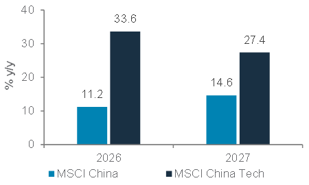 2026 and 2027 EPS growth forecast for MSCI China index vs MSCI China Technology index