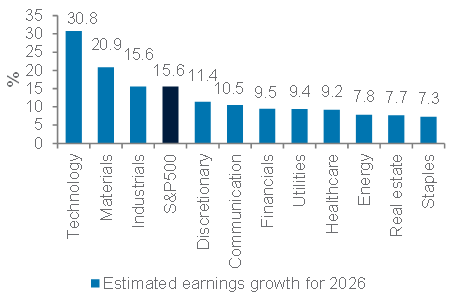 We expect US earnings to grow by 15.6% in 2026, following 13.3% growth in 2025. Growth in 2026 is likely to be led by the technology sector (30.8% growth) amid strong AI investment, and the materials sector (20.9%) amid a cyclical recovery.