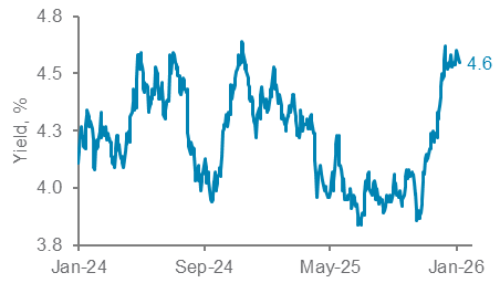 Near-term risks: The US jobs report for December due today (consensus estimate: 70,000) and inflation report next week (consensus for core inflation: 0.3% m/m, 2.7% y/y) are near term risks. The US remains in a low hiring, low firing mode, with payrolls contracting in three of the past six months. Data this week showed US job openings fell in November to the second lowest level in five years, although jobless claims remain low. A a weak payrolls report would lead to a dovish response from the Fed. Fed Governor and Trump appointee Miran said this week the Fed needs to cut rates by 150bps this year. Trump’s nomination of the next Fed Chair is a key near-term focus.