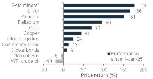 Prefer gold and gold miners: After a strong rally, silver faces short-term headwinds from stretched investor positions, with key resistance at USD 82-84. Medium-term tailwinds include strong momentum and lift from higher gold prices. As a ‘catch-up trade’ we prefer gold mining equities. We also remain bullish on gold with an end-2026 target of USD 4,800/oz (see page 6).