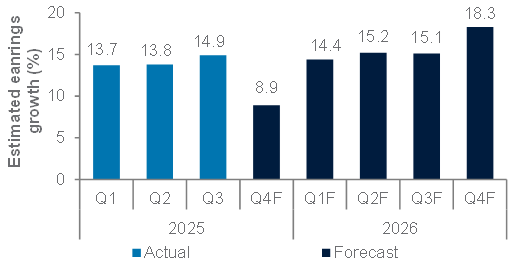 Our view: We expect US earnings growth to be modest in Q4 2025 but to re-accelerate thereafter. We prefer technology, healthcare and utilities.
