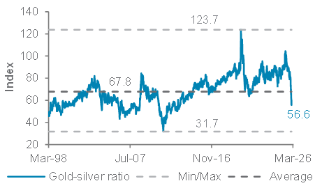 While silver continues to benefit from manufacturing demand, particularly linked to AI and electronics, its recent outperformance can arguably be attributed to a ‘catch-up trade’ with gold. The gold-to-silver ratio has fallen sharply from its recent peak to its lowest level since 2013.