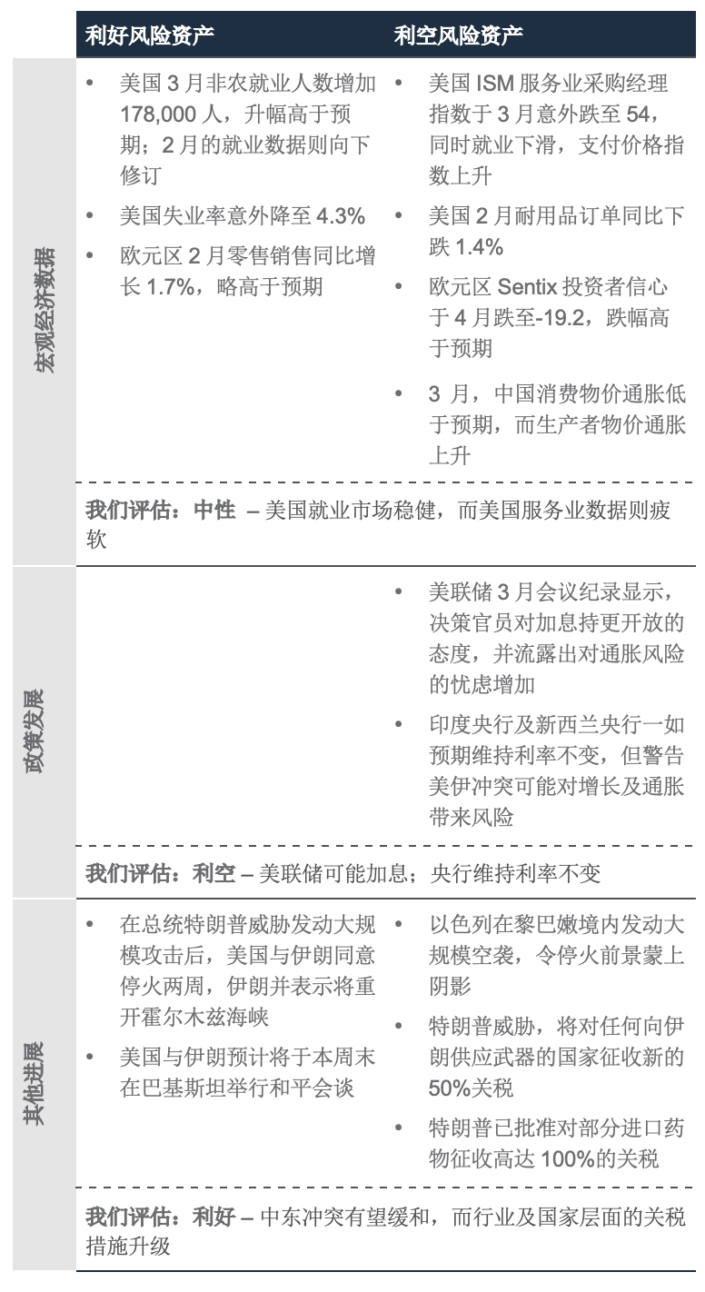 宏观及政策发展依然利好风险资产:撇开中东冲突不谈,美国上周的就业市场数据显示,新增职位与失业率均改善。印度央行和新西兰央行维持利率不变的决定,与较早前美联储及欧洲央行维持利率不变的决定一致。新西兰央行的鹰派措辞,意味着新西兰元有走强空间,特别是相对于我们预期美元走弱的观点。虽然各大主要央行的言论均表露出对高油价可能带来的风险的忧虑,但它们在控制通胀风险与支持增长之间展现出的平衡取向,提供了相对利好的环境。我们仍然预期美联储在上半年维持利率不变,并于下半年恢复减息。