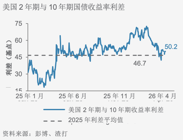 美国2年期与10年期国债收益率利差已回落至2025年的水平