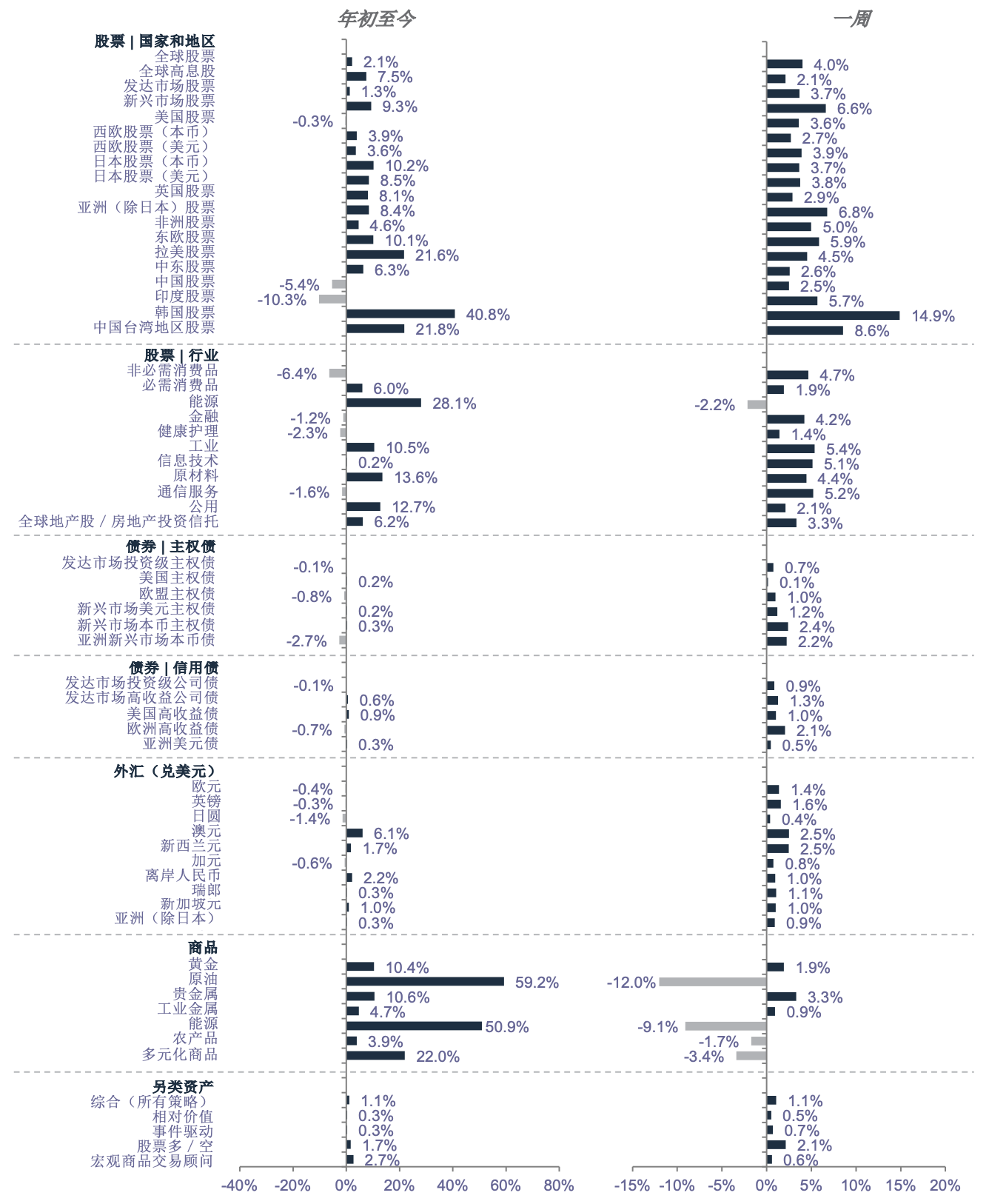 *除非另外说明,否则所有表现均以美元计价。“2026年初至今”指2025年12月31日到2026年4月9日的表现;“过去一周”指2026年4月2日至2026年4月9日的表现
