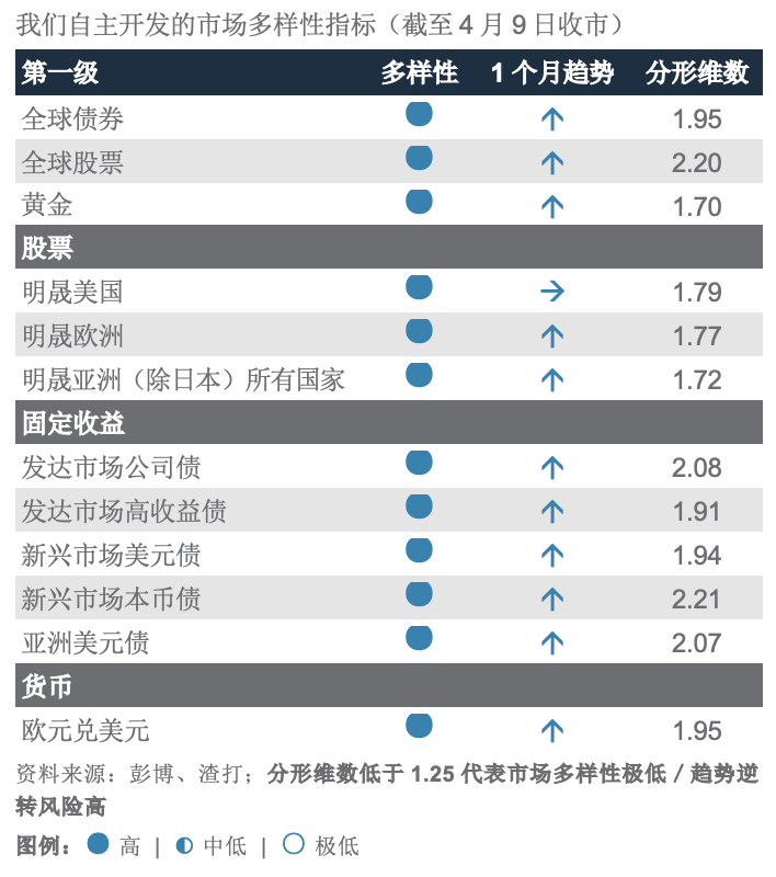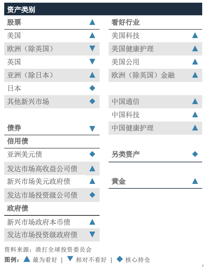 目前,我们继续偏好多元化投资组合,以及下行风险对冲工具,如通胀挂钩债券。随着央行卖出压力缓和,黄金预计将上涨。