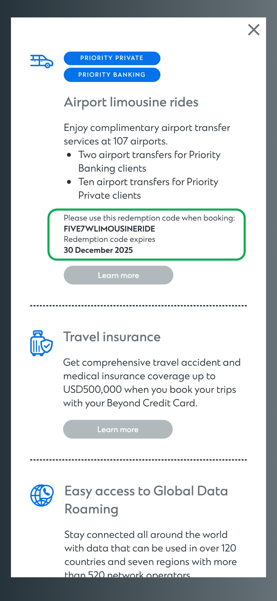 Eligible customers will be able to redeem their Airport Limousine Transfer codes via the SC Mobile app within fourteen (14) working days of the approval of their Beyond Credit Card or attaining a Priority Banking or Priority Private relationship with the Bank.