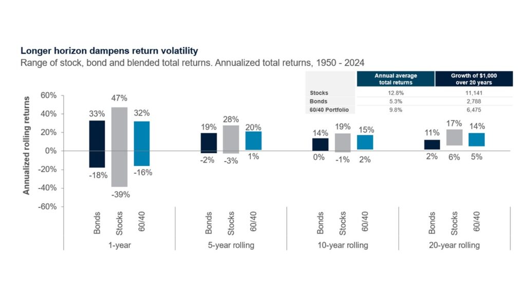 Returns shown are based on calendar year returns from 1950 – 2024. Stocks represented by the S&P Shiller Composite Index. Bonds represented by the US 10-year yield