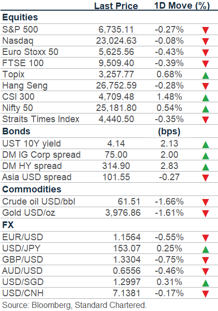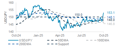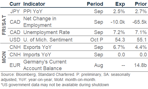 USD bounce faces US consumer sentiment test: The USD rose for the fourth day as investors dialled back the Fed’s 2026 rate cut expectations following the central bank’s September policy meeting minutes released earlier this week. Meanwhile, political and economic uncertainty in France and Japan also dragged G10 peers lower, which partially offset impact from a continued US government shutdown. We expect a 50bps Fed rate cut by year-end, with an additional 50bps cuts by Q3 26, in line with money market projections. The next focus is the University of Michigan’s US consumer sentiment data due today. Any upside surprises in sentiment and the inflation projections in October will likely exert upward pressure on the USD index (DXY), enabling it to challenge the 100 mark, its highest since 1 August.