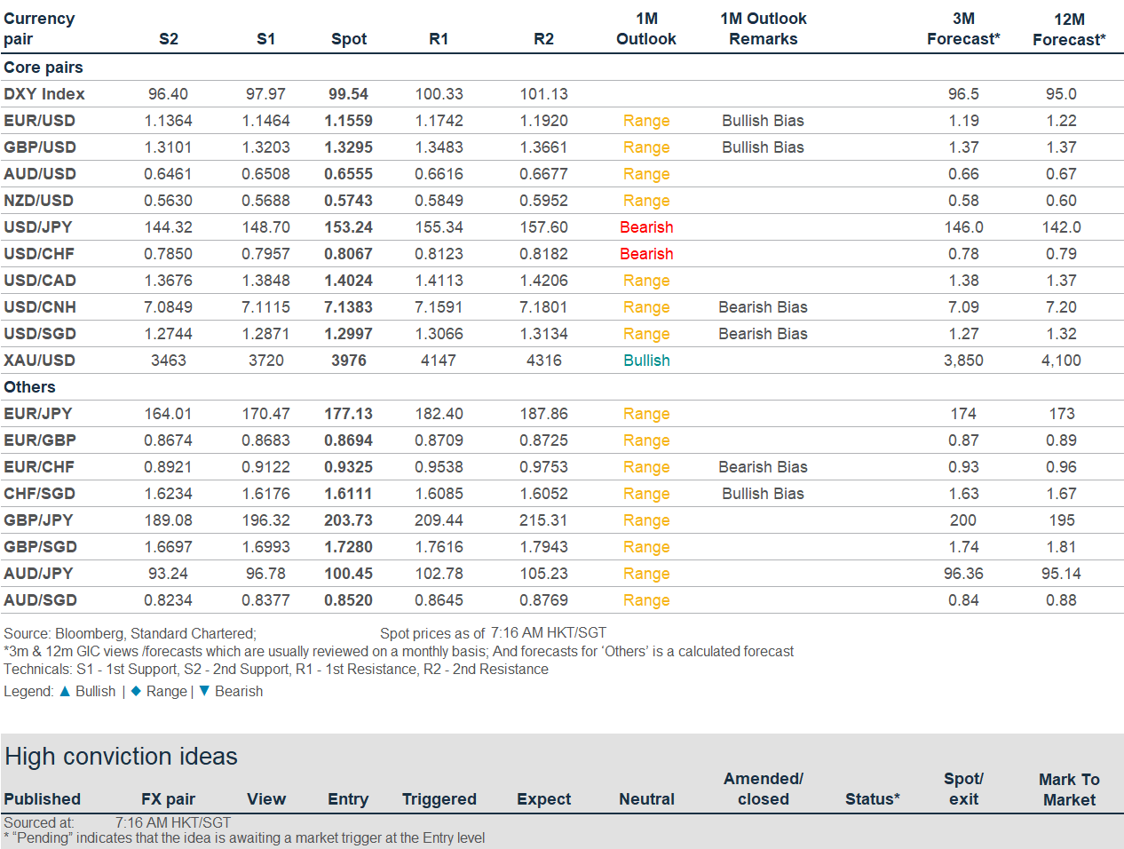 Banking activities may be carried out internationally by different branches, subsidiaries and affiliates within the Standard Chartered Group according to local regulatory requirements. Opinions may contain outright “buy”, “sell”, “hold” or other opinions. The time horizon of this opinion is dependent on prevailing market conditions and there is no planned frequency for updates to the opinion. This opinion is not independent of Standard Chartered Group’s trading strategies or positions. Standard Chartered Group and/or its affiliates or its respective officers, directors, employee benefit programmes or employees, including persons involved in the preparation or issuance of this document may at any time, to the extent permitted by applicable law and/or regulation, be long or short any securities or financial instruments referred to in this document or have material interest in any such securities or related investments. Therefore, it is possible, and you should assume, that Standard Chartered Group has a material interest in one or more of the financial instruments mentioned herein. Please refer to our Standard Chartered website under Regulatory disclosures for more detailed disclosures, including past opinions/ recommendations in the last 12 months and conflict of interests, as well as disclaimers. A covering strategist may have a financial interest in the debt or equity securities of this company/issuer. All covering strategist are licensed to provide investment recommendations under Monetary Authority of Singapore or Hong Kong Monetary Authority. This document must not be forwarded or otherwise made available to any other person without the express written consent of Standard Chartered Group.