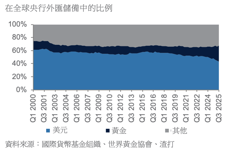 圖. 2 黃金在各央行儲備中的比例繼續上升,主要反映美元儲備佔比下降