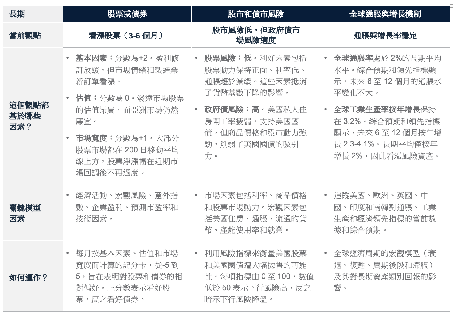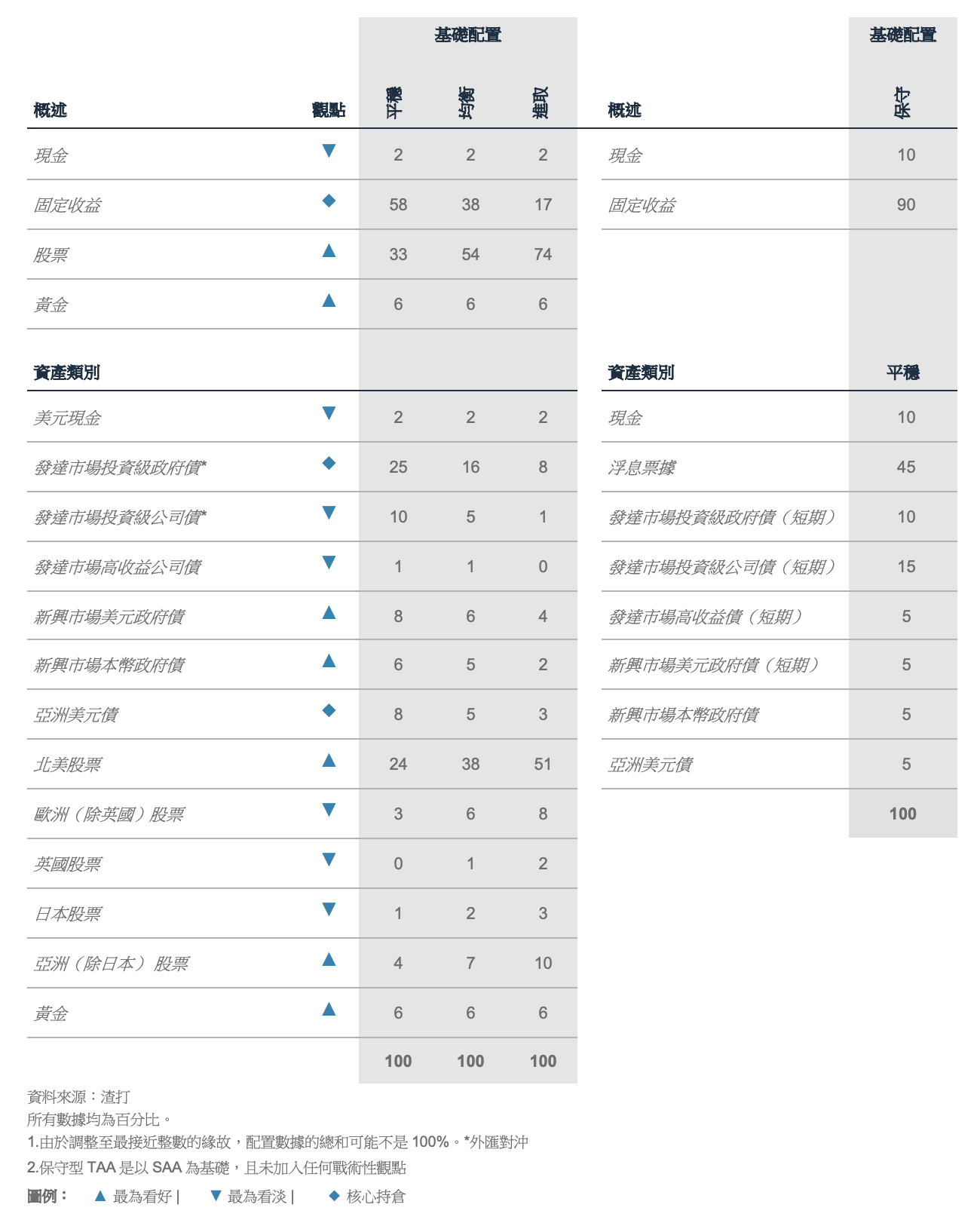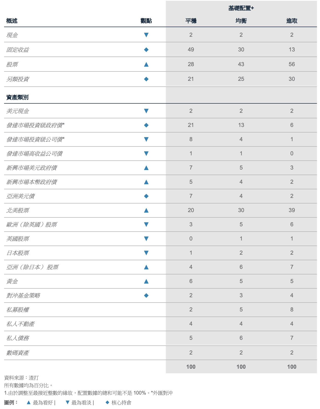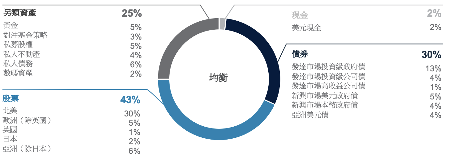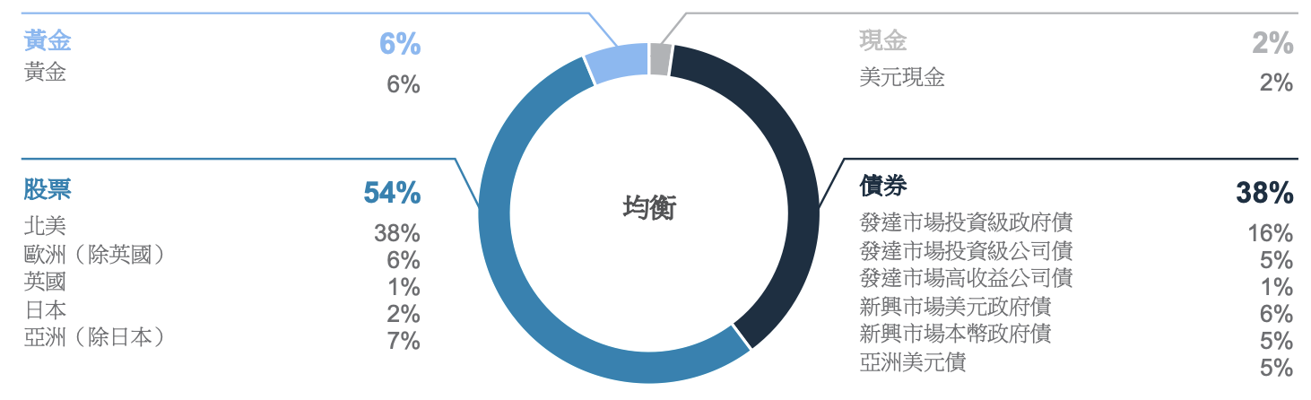 1. 第5頁的圖表僅展示均衡風險的資產配置 — 不同風險狀況可能產生顯著不同的資產配置結果。第5頁僅作示範與參考之用,並不構成投資建議、要約、推薦或招攬。此等配置並未考慮特定人士或特定類別人士的具體投資目標、需要或風險承受能力,以及並非為任何特定人士或特定類別人士而編製。