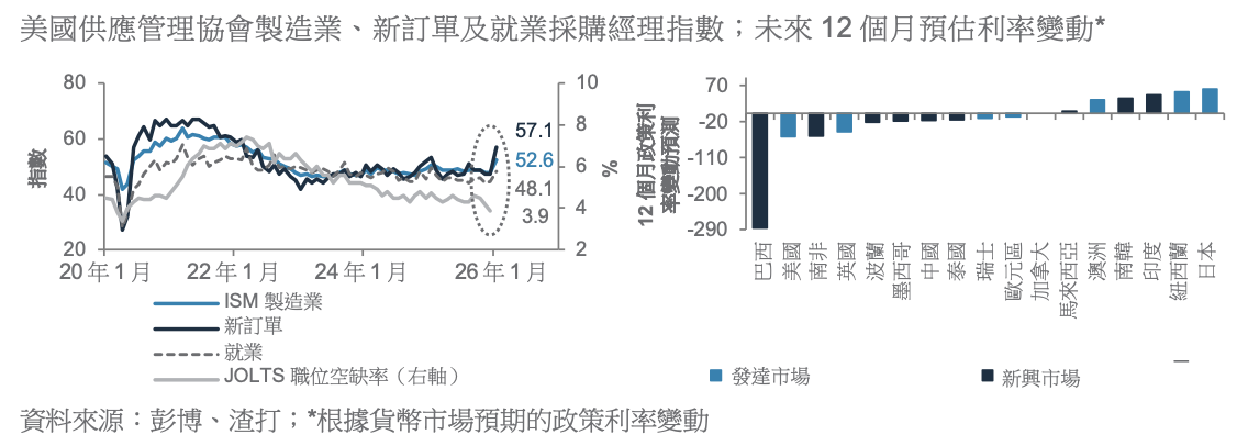 核心情境(軟著陸,60%機率):在美國、德國和日本推出財政刺激措施、貿易緊張局勢緩和,以及去年全球貨幣政策寬鬆的背景下,我們維持經濟軟著陸的預期。美國1月的就業報告強勁,使市場對聯儲局減息的預期推遲至提名主席沃什於5月上任之後。我們預期在沃什領導下,聯儲局將在今年減息75個基點至3%,以在關稅驅動的通脹消退之際,重振仍然疲弱的就業市場。歐洲央行今年或維持利率在2%,因為德國的財政刺激逐步顯現成效。中國可能會在第二季放寬政策,以維持由高科技及消費帶動的增長。
