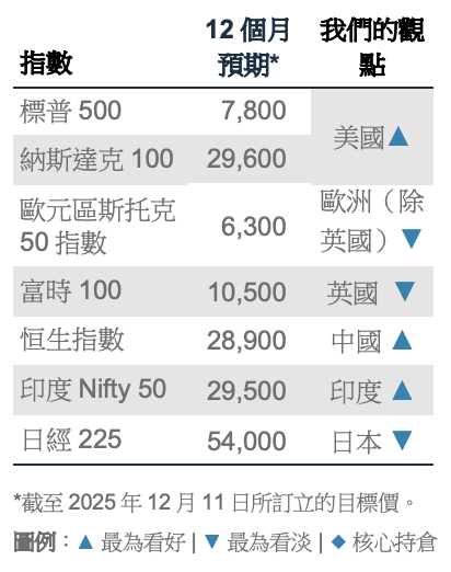 預計亞洲(除日本)未來一年的盈利增長最高。在該地區,我們偏好中國和印度股票,預期管治改善和不斷推出的財政措施將推動股票上漲。我們維持低配歐洲(除英國)股票及英國股票,因為它們過於防守性且估值不再吸引。歐洲各出口國面臨歐元走強的挑戰,而英國的財政狀況仍然脆弱。我們亦低配日本股票,反映2026年的盈利增長預測溫和。我們保留對美國股票的核心配置。宏觀環境利好和美國盈利增長強勁是正面因素,抵消了美國財政可持續性的相關憂慮。美元疲弱提振了美國企業的盈利,但通常會使美股相對非美國市場表現遜色。我們建議削減對美國股票的過多長倉。