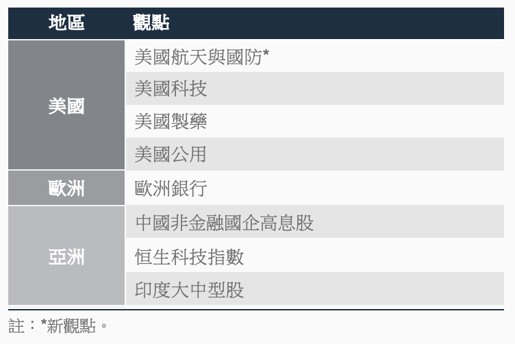 話雖如此,在此輪泡沫爭論下,我們確實認為應避免過度集中配置於人工智能和科技行業。我們仍然超配美國股票,偏好美國科技行業。然而,我們也看好健康護理和公用行業。基於航空交通增長穩健和地緣政治風險,我們開啟對美國航天與國防行業的機會型投資觀點。