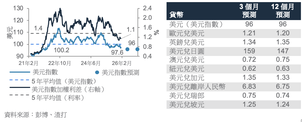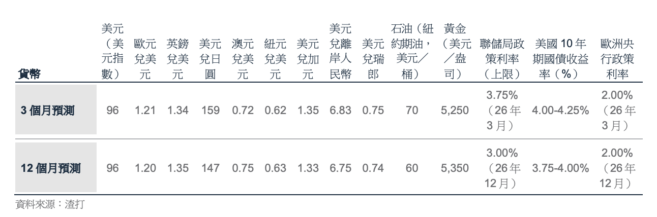 我們預計未來1至3個月內,美元將小幅跌至96,而我們的12個月預測亦維持在此水平。自2026年初以來,市場已明顯出現廣泛拋售美元的情況。隨著美國經濟增長放緩,且相對於全球其他央行,聯儲局的政策立場對美元的支持力度減弱,我們預計美元短期面臨溫和的下行風險。此外,中國監管機構近日就銀行持有美國國債所發出的警示,也為美元情緒帶來新的阻力。整體而言,儘管前景顯示美元可能進一步呈現結構性走弱,但12個月的目標水平顯示,大部分調整將在前期完成,而非在較長時間內持續發生。