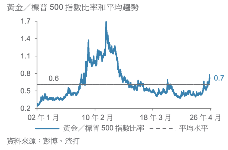 圖. 16 黃金/標普500指數比率升至高於長期平均水平,凸顯市場對避險資產需求再度升溫