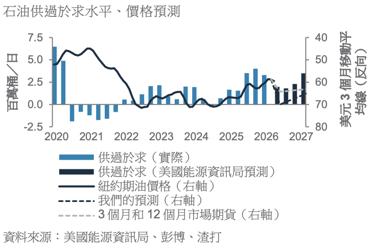 石油展望:油價仍然受制於疲弱但逐步收緊的供需平衡,市場縮小了供應過剩的預測。油組及盟友(OPEC+)可能審慎管理產量,以便在捍衛油價的同時避免過度收緊供應或流失市場份額。地緣政治緊張局勢加劇,有助於維持油價的風險溢價,但過往經驗顯示,這些衝擊往往引發短暫而劇烈的上漲,而非持久的重新定價。如果未出現實物供應的長期中斷或更廣泛的區域衝突升級,油價上漲勢頭應會消退,油價走向仍然由供需的基本因素主導。