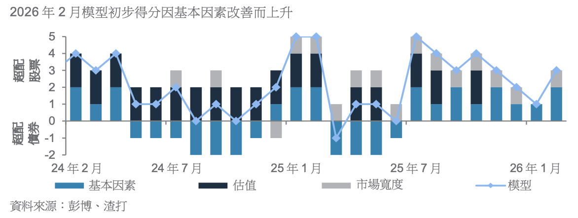 我們的股債模型超配股票。2月模型初步得分升至+3,反映在基本因素改善下,股票釋放出更看漲的訊號。