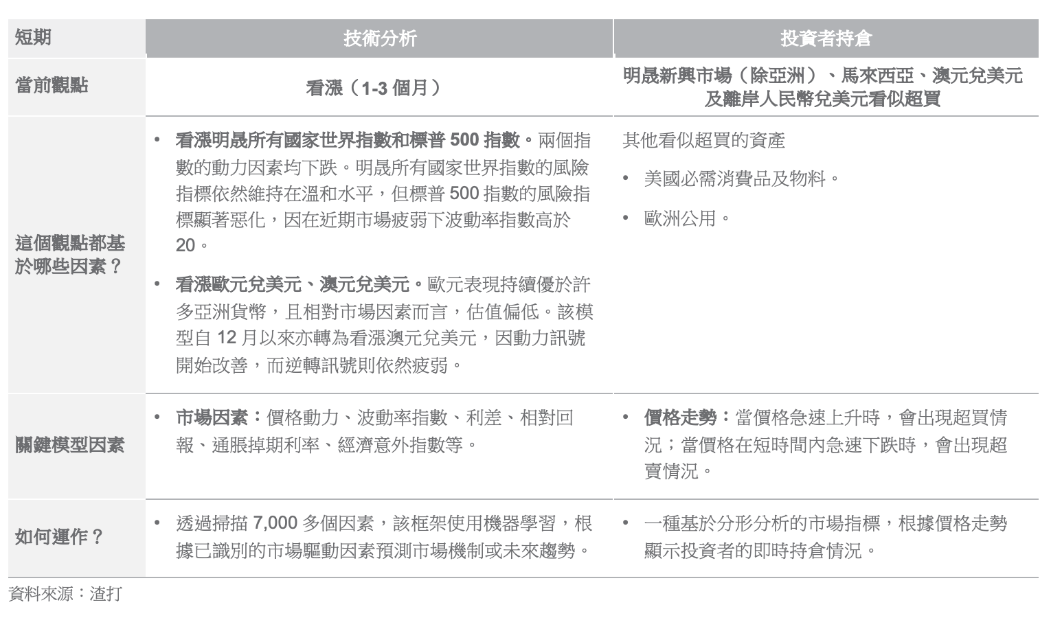 我們的短期股票模型(1-3個月觀點)預測熊市尚未出現。標普500指數和明晟所有國家世界指數的熊市預估機率分別為42%和17%。兩個指數的動力指標均下跌。明晟所有國家世界指數的風險指標依然維持在溫和水平,但標普500指數的風險指標顯著惡化,因在近期市場疲弱下波動率指數(VIX)高於20。我們的短期貨幣模型亦看漲歐元兌美元、澳元兌美元。歐元兌美元的表現繼續相對優於許多亞洲貨幣,且相對市場因素而言,估值仍偏低。此外,動力指標目前對澳元兌美元提供強勁支持,逆轉訊號疲弱。我們的短期模型年初至今每項資產均錄得正向回報。