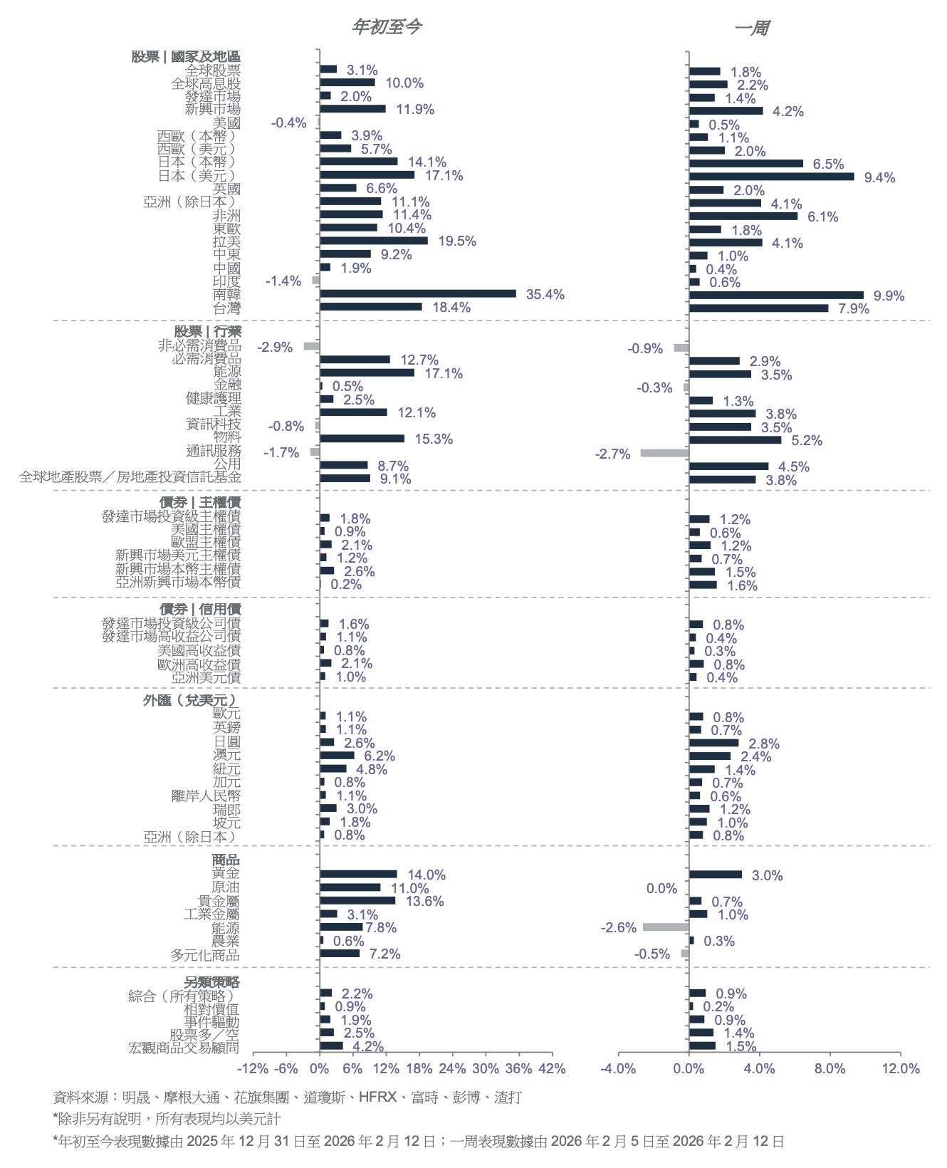 - 2026年初,經濟增長與盈利能力提升,為市場前景增添了樂觀因素。在盈利增長和多元化投資需求的支持下,我們對股票和黃金的偏好至今表現理想。