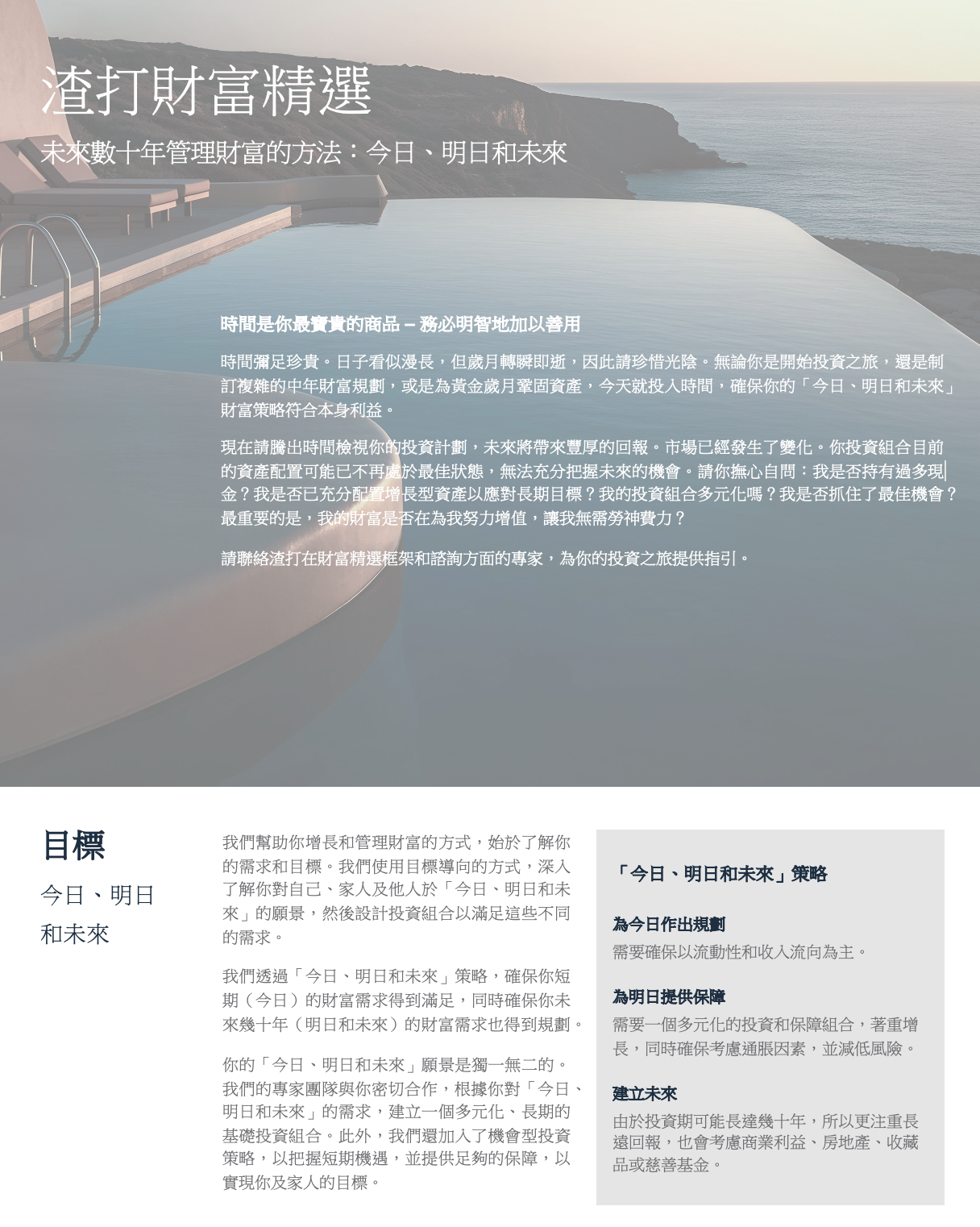 本文件內容保密,也僅限指定人士閱覽。如果閣下並非本文件的指定收件人,請銷毀全部副本並立即通知發件人。本文件僅供一般參考,受渣打網站的監管披露下相關免責聲明所約束。本文件並非且不構成針對任何證券或其他金融工具訂立任何交易或採納任何對沖、交易或投資策略的研究材料、獨立研究、要約、推薦或招攬行為。本文件僅用作一般評估,並未考慮任何特定人士或特定類別人士的具體投資目標、財務狀況或特定需求等,亦非專為任何特定人士或特定類別人士擬備。閣下不應依賴本文件的任何內容作出任何投資決定。在作出任何投資之前,閣下應該仔細閱讀相關發行文件並徵詢獨立的法律、稅務及監管意見,特別是我們建議閣下務須在承諾購買投資產品之前,考慮本身的具體投資目標、財務狀況或特定需求,就投資產品的適合性徵詢意見。意見、預測和估計僅為渣打發表本文件時的意見、預測和估計,渣打可修改而毋須另行通知。過往表現並非未來績效的指標,渣打銀行並無對未來表現作出任何陳述或保證。投資價值及其收益可升可跌,閣下可能無法收回原始投資的金額。閣下不一定能賺取利潤,可能會蒙受損失。本文件對利率、匯率或價格的未來可能變動或者未來可能發生的事件的任何預測僅為參考意見,並不代表利率、匯率或價格的未來實際變動或未來實際發生的事件(視屬何情況而定)的指標。未經渣打集團(定義如下)明確的書面同意,本文件不得轉發或以其他方式提供予任何其他人士。渣打銀行根據《1853年皇家特許令》(參考編號ZC18)在英格蘭以有限責任形式註冊成立,主要辦事處位於英格蘭,地址為1 Basinghall Avenue, London, EC2V 5DD。渣打銀行獲審慎監管局(Prudential Regulation Authority)認可,並受金融市場行為監管局(Financial Conduct Authority)和審慎監管局規管。渣打銀行的最終母公司渣打集團有限公司(Standard Chartered PLC)連同其附屬公司及關聯公司(包括每間分行或代表辦事處)組成渣打集團。渣打私人銀行乃渣打轄下私人銀行部門。渣打集團內各法律實體及聯屬公司(各為「渣打集團實體」)可根據當地監管要求在全球開展各種私人銀行業務。並非全部產品及服務都由渣打集團內的所有分行、附屬公司及聯屬公司提供。部分渣打集團實體僅擔任渣打私人銀行的代表,不可提供產品和服務或向客戶給予意見。