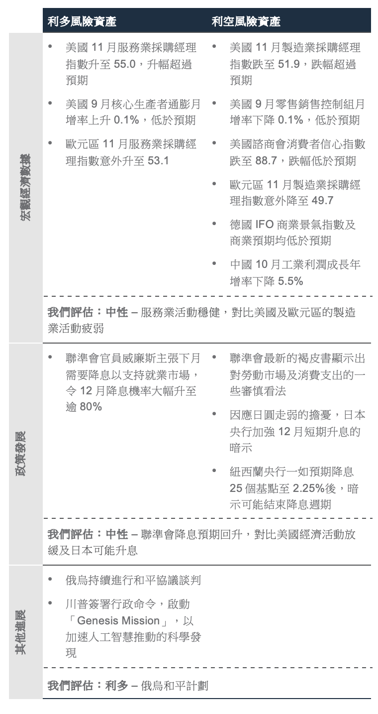 策略摘要:在12月10日聯準會政策會議召開前,市場對聯準會降息的預期持續起伏不定。紐約聯邦儲備銀行行長威廉斯(Williams)在發表了鴿派言論後,使原本微妙的平衡再度傾向於12月份降息,並重振了投資者情緒。雖然12月是否降息取決於即將公布的數據,但我們預期隨著就業市場降溫,2026年第一季將進一步降息。