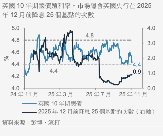 英國10年期國債殖利率的支持位在4.4%。市場已經反映英國央行很大機會在即將召開的12月會議上降息。通膨偏高(儘管近期有所緩和)和對財政可持續性的憂慮等挑戰,將阻礙殖利率進一步大幅下滑。